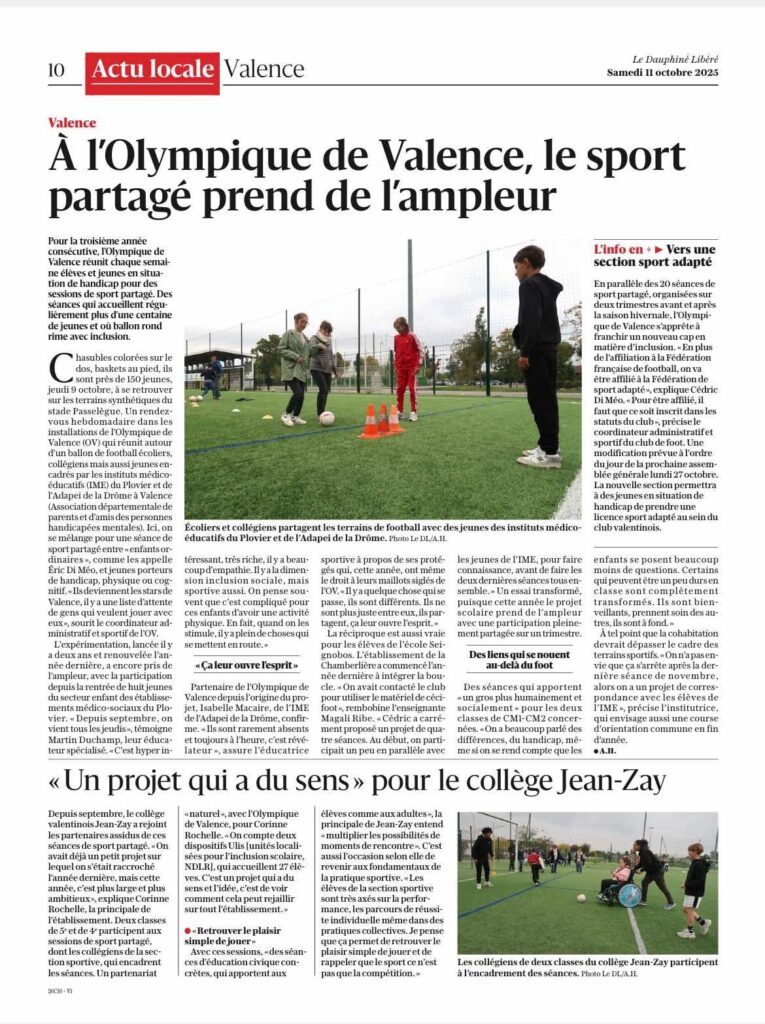 Pour la troisième saison consécutive, l’OLYMPIQUE DE VALENCE propose une activité parafootball pour des jeunes en situation de handicap.